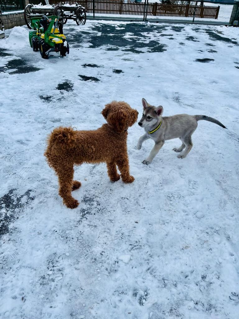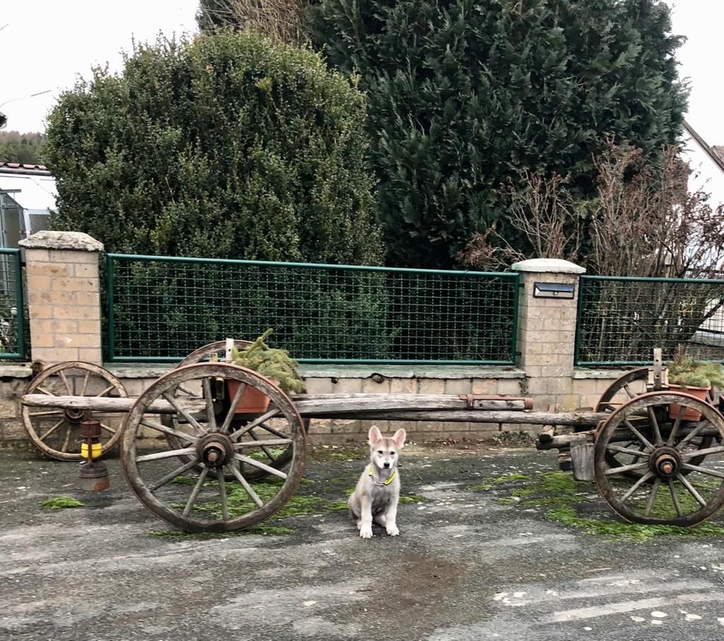 Zwei Jahre lang haben mein Freund und ich uns überlegt, einem Hund ein zu Hause zu schenken. Wölfe und Wolfshunde fanden wir schon immer spannend, daher sollte die Rasse auch in diese Richtung gehen. Zufällig stießen wir im September 2023 auf die Hundezucht von Jeannette und Robert Rupp und dass noch zwei rote Rüden zu Ende Oktober zu vermitteln waren. Schon bei dem ersten Telefonat war uns Jeannette direkt sympathisch. Da wir uns schon lange informiert hatten, hatten wir bestimmte Vorstellungen und Erwartungen an einen Züchter, die Jeannette mit dem ersten Telefonat sofort erfüllte. Sie informierte uns nicht nur über das Wesen und den Charakter eines Marxdorfer Wolfshundes, sondern stellte auch klar, welche Anforderungen die zukünftigen Besitzer zu erfüllen haben, damit Robert und Jeannette ihnen einen Welpen anvertrauen. Bei unserem ersten Besuch hatten wir eine Liste mit Fragen zu verschiedenen Themen dabei, die wir geklärt haben wollten (bspw.: Sozialisation, Papiere, Impfung, Training, …). Auf die Frage, ob es ok sei, diese Fragen zu stellen, bekamen wir die Antwort: „Wir wären enttäuscht, hättet ihr keine Fragen dabei“. Diese Antwort machte die beiden noch sympathischer. Es wurde immer mehr deutlich, dass den Eheleuten Rupps die Gesundheit und das Wohlergehen ihrer Hunde am Herzen liegt und auch die Sicherstellung, dass die Welpen bei ihren zukünftigen Besitzern gut aufgehoben sind. Anschließend durften wir mit adulten Tieren spazieren, die Elterntiere kennenlernen und schließlich die Welpen sehen. Schnell wurde klar, dass ein Rüde bei uns einziehen soll. Ende Oktober durften wir den kleinen abholen und hatten etwas Sorge angesichts der 6-stündigen Autofahrt, die jedoch problemlos verlief (abgesehen von der normalen Nervosität des Welpen). In seinem neuen zu Hause fand er seine Box (der zukünftige Schlafplatz) sehr gut. Es stellte sich heraus, dass der kleine Mann Höhlen und Boxen, wo er sich zurückziehen kann, klasse findet. Nachts schlief er problemlos in seiner Box, wir waren jedoch immer mit ihm Zimmer, damit er sich an uns gewöhnt und er nicht direkt allein sein muss. Es erstaunte uns, dass er sich sofort meldete, wenn er raus musste (fiepen und an das Gitter kratzen). Auch nach dem Aufwachen tagsüber ging es sofort raus. In den ersten zwei Tagen gab es zwei Unfälle auf dem Teppich (da wir die Zeichen noch nicht kannten). Die Anzeichen zeigte er uns jedoch und ab Tag drei gab es keinen Unfall in der Wohnung mehr. Mit jedem Tag wurde er mehr und mehr zutraulicher und kuschelte sich langsam gut bei uns an. Nach jedem Ausflug draußen lässt er sich die Pfoten sauber machen und bei Regen trocken rubbeln. Auch wenn er an Dreck oder Steinen nagt, lässt er sich problemlos ins Maul fassen. Am dritten Tag lernte er bereits verschiedene Dinge kennen (fremde Menschen, Laubbläser, Akkuflex, Box im Auto, unser Angelgrundstück, Zoo Laden, Hauptstraße, etc…). Mit jedem Tag wurde der anfänglich schüchterne Welpe immer mutiger. Fremde Menschen werden zunächst für ein paar Minuten begutachtet und dann vorsichtig beschnüffelt. Viele neue Sachen werden zunächst von Weitem beobachtet und dann geht er neugierig drauf zu. Sich von unserem Grundstück zu entfernen, stellt mittlerweile auch kein Problem mehr dar. Der Besuch der Tierärztin am vierten Tag schien für ihn sehr stressfrei. Die Tierärztin hatte so viele Leckerlis, dass er die zweite Impfung nicht bemerkte. Auch hier ließ er sich überall untersuchen und die Diagnose war: ein gesunder, gut genährter Welpe, der zwar reserviert, aber neugierig auf seine Umwelt ist. Dass die erste Woche mit unserem Floki so entspannt läuft, er sich so gut an uns gewöhnt hat und seiner Umwelt gegenüber immer offener wird, hätten wir nicht unbedingt erwartet. Wenigsten auf ein paar zernagte Gegenstände hatten wir uns eingestellt. Doch mit liebevoller Art, wird er immer wieder darauf hingewiesen, dass er ein eigenes Spielzeug zum Nagen hat und der Rest tabu ist. Jetzt geht es erwartungsvoll und freudig in die zweite Woche und wir sind gespannt, wie er sich weiterentwickelt. Wir sind sehr glücklich, Jeannette und Robert kennengelernt zu haben. Auch nach dem Abholen zeigte sich, dass sie an dem neuen Alltag des Welpen interessiert sind, und es wird sich weiterhin ausgetauscht. Auch bei Sorgen und Fragen haben wir immer die Möglichkeit, uns bei ihnen zu melden und uns Ratschläge und Tipps abzuholen. Vielen Dank dafür.