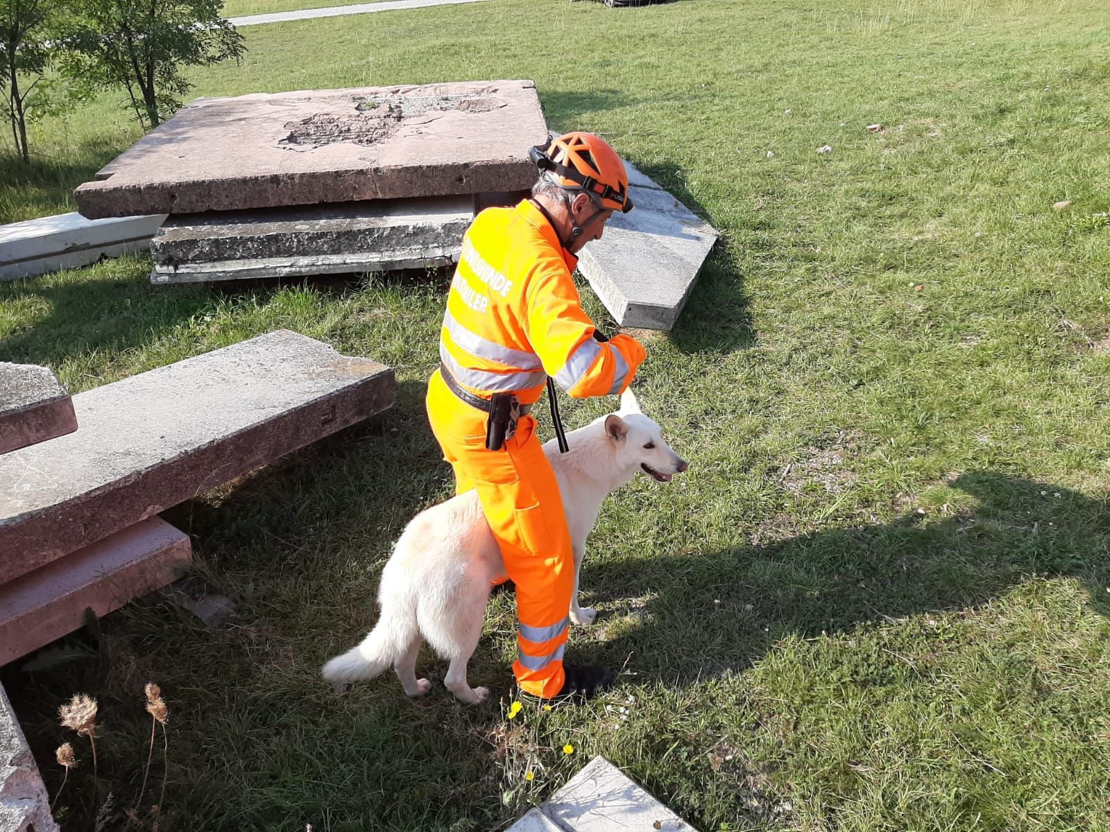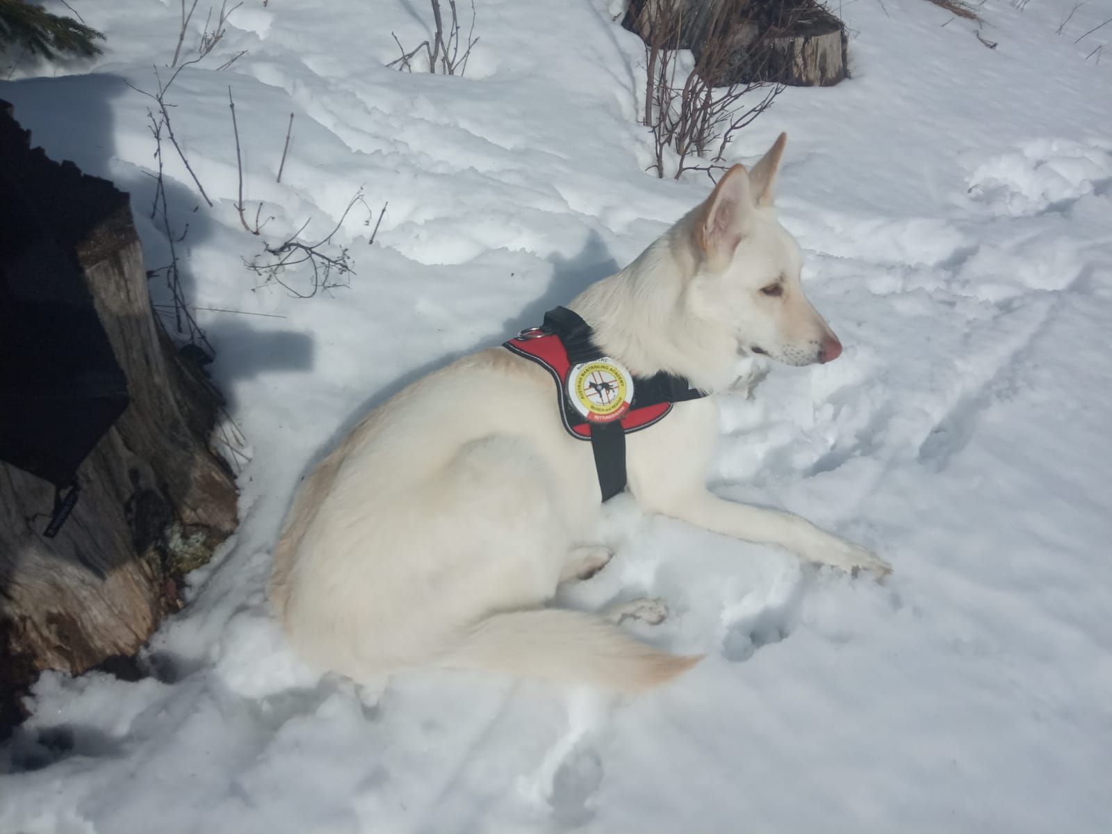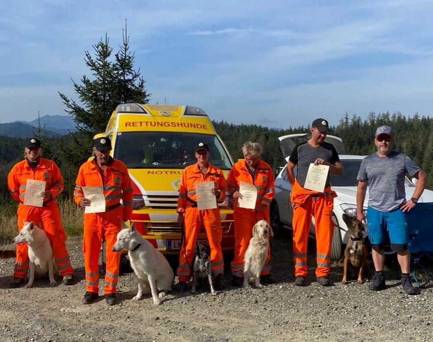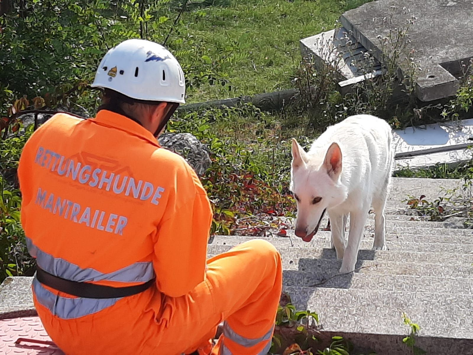Mantrailing Ausbildung hat ca. 3Jahre gedauert. Menschen suchen in Stadt und Umgebung wird trainiert. Im Wald wird Flächensuche und Wegsuche ohne Leine gelernt,auch Trümmersuche ist Teil der Ausbildung.